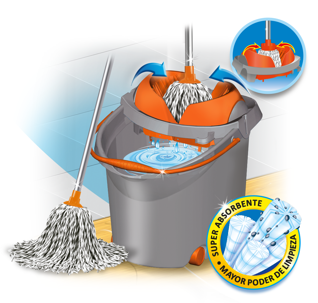 El set está compuesto por una mopa de 100% microfibras con cabo de acero inoxidable, y un balde con sistema de escurrido con movimiento que elimina el agua más rápido y sin esfuerzo. Es ideal para cualquier tipo de superficie como cerámicos y porcelanatos, e incluso para suelos delicados como parquet y pisos flotantes. El repuesto de microfibra incluido es lavable a mano o en lavarropas. Escurrido con Movimiento. 100% Microfibra. Ideal para pisos flotantes, parquet y porcelanato.