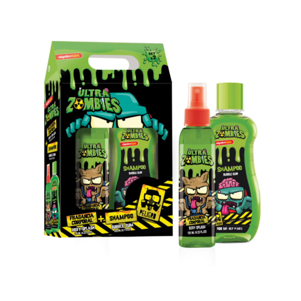 Es un set con un novedoso diseño de Ultra Zombies. Contiene una deliciosa fragancia corporal y un Shampoo temáticos.